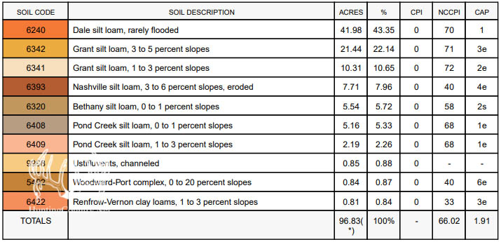 This cultivated cropland is made up of majority Class I soils. The remaining soil profiles are made up of some Class II and III soils consisting of Dale Silt Loam and Pond Creek Silt Loam with 0 to 1 percent slopes. The Class II soils present on this property consist mostly of Grant Silt Loam 1 to 3 percent slopes and Bethany Silt Loam 0 to 1 percent slopes.