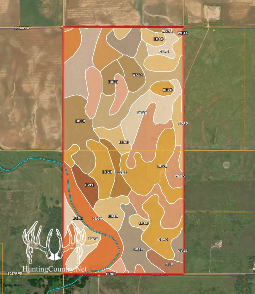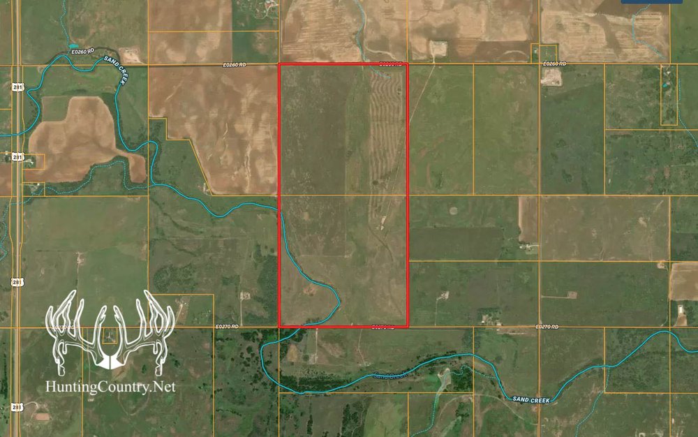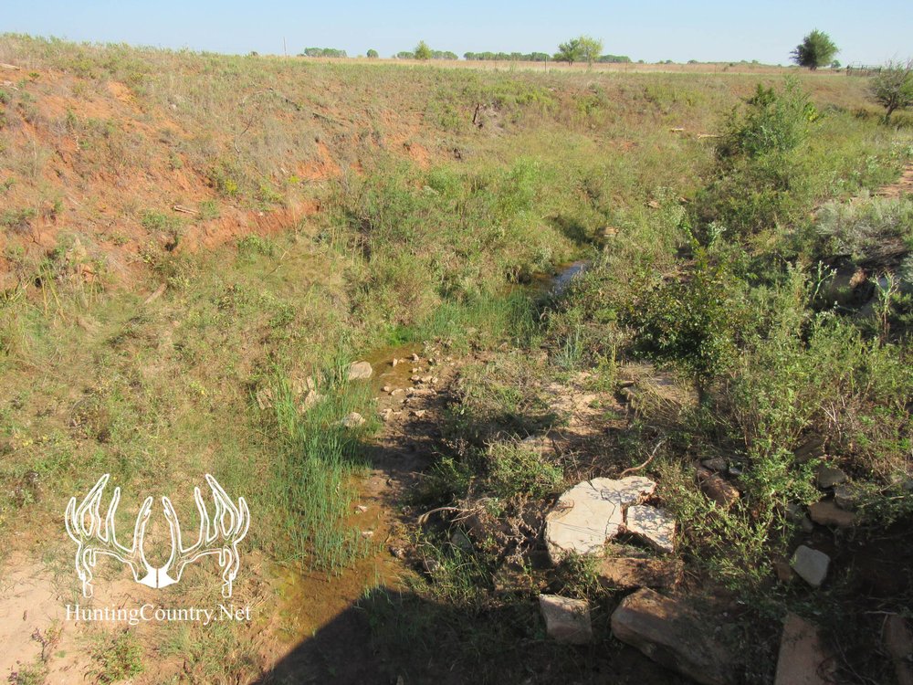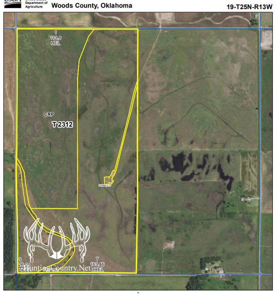 320 acres m/l. Woods County Oklahoma Land for sale with CRP income. The property offers gentle rolling hills and a live creek running through ½ the property. This farm is located in the heart of deer country. Thick cover is located just south of this property with green fields located to the west. The rolling terrain is covered with a mixture of native grass pasture with short & mid-level grasses that provide bedding areas for Deer, excellent habitat for upland game and livestock grazing. Several large plum thickets are scattered thought out the farm. A water well is located in the Southwest corner of the property to provide water for the livestock.