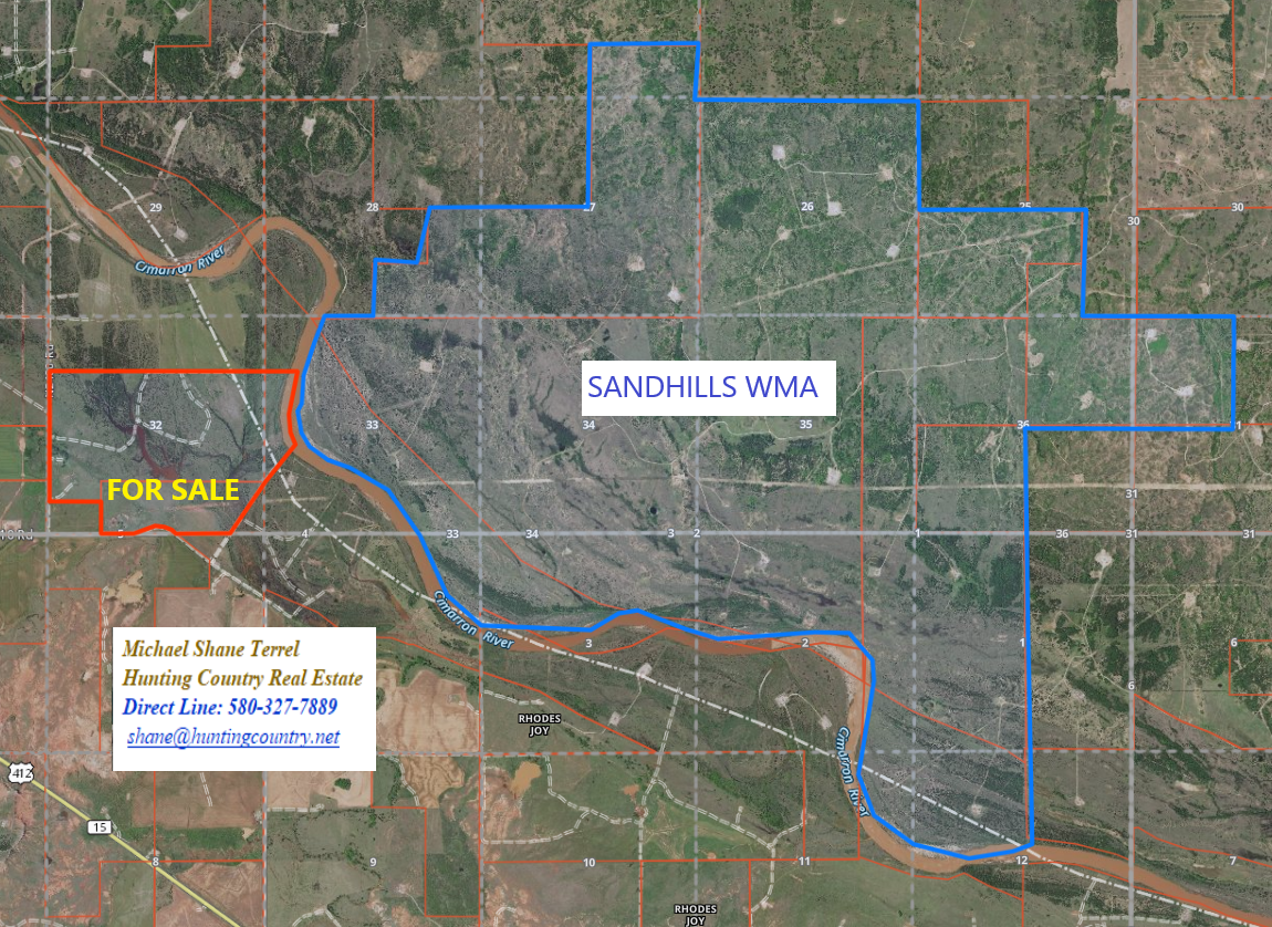 470 acres m/l. Major County Oklahoma Hunting Land for sale on the CIMARRON RIVER bordering the 5,212 acre SANDHILLS WILDLIFE MANAGEMENT AREA.
